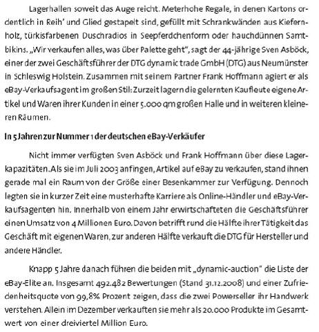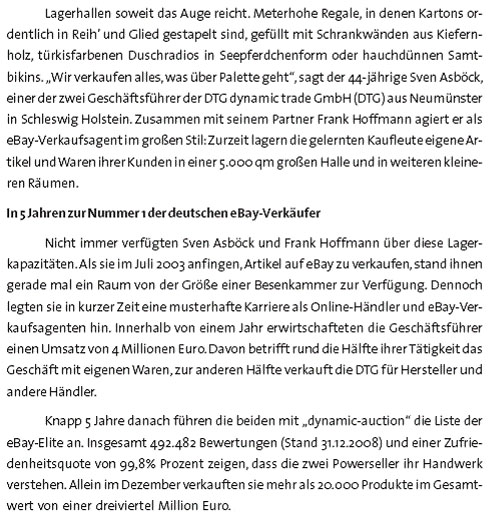 Nicht immer verfügten Sven Asböck und Frank Hoffmann über diese Lagerkapazitäten. Als sie im Juli 2003 in Kooperation mit der DHL anfingen, Artikel auf dem weltweiten Online-Marktplatz (www.ebay.de) zu verkaufen, stand ihnen gerade mal ein Raum von der Größe einer Besenkammer zur Verfügung. Dennoch legten sie in kurzer Zeit eine musterhafte Karriere als Online-Händler und eBay-Verkaufsagenten hin. Kein Wunder, als ehemalige Mitarbeiter des Versandhauses Oppermann verfügten die beiden von der ersten Online-Transaktion an über hilfreiche Branchenkenntnisse. Dieses Fachwissen spiegelt auch die Arbeitsteilung des Zweier-Teams wider: Sven Asböck ist für die Beschaffung und Qualitätssicherung der Ware zuständig, Frank Hoffmann für die EDV und den Internetauftritt. Der professionelle Einstieg bei eBay hat sich für die DTG gelohnt: Innerhalb von einem Jahr erwirtschafteten die Geschäftsführer mit ihrem eBay Shop „dynamic-auction“ einen Umsatz von vier Millionen Euro. Davon ist rund die Hälfte Geschäft mit eigenen Waren, zur anderen Hälfte verkauft die DTG für Hersteller und andere Händler. Mittlerweile haben die PowerSeller aus dem Norden Deutschlands den Platinstatus im eBay-PowerSeller-Programm erreicht. Dieses Level erreichen professionelle eBay-Händler, die entweder ein Handelsvolumen von 150.000 Euro pro Monat haben oder innerhalb von vier Wochen 5.000 Artikel verkauft haben. Die DTG ist unter den Top 15 der erfolgreichsten eBay-PowerSeller in Deutschland.
